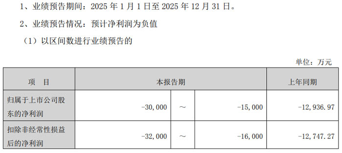 歸屬于上市公司股東的凈利潤(rùn)本報(bào)告期預(yù)計(jì)為 - 30,000 萬(wàn)元至 - 15,000 萬(wàn)元,上年同期為 - 12,936.97 萬(wàn)元;扣除非經(jīng)常性損益后的凈利潤(rùn)本報(bào)告期預(yù)計(jì)為 - 32,000 萬(wàn)元至 - 16,000 萬(wàn)元,上年同期為 - 12,747.27 萬(wàn)元。