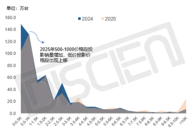 2025年投影市場均價微漲至2076元,價格結(jié)構(gòu)持續(xù)優(yōu)化。500元以下嘗鮮機(jī)型份額大幅收縮至19.3%,銷量同比下降29.9%,成為衰退最明顯的價格段。500-1000元價格段占比提升至24.7%,成為第一大價格帶。