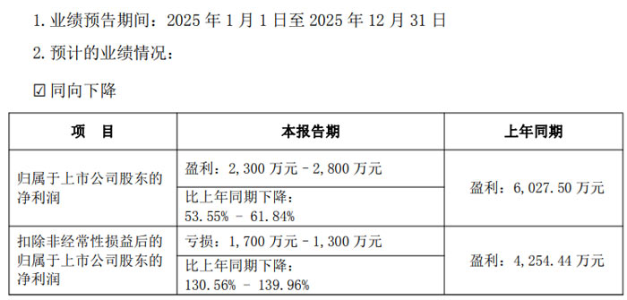 蘇州錦富技術(shù)股份有限公司公告顯示,公司 2025 年仍陷虧損,但扣除非經(jīng)常性損益后的虧損幅度較上年同期有所收窄。歸母凈利潤:預(yù)計(jì)虧損 28,000.00 萬元 - 36,000.00 萬元,上年同期虧損 26,717.09 萬元;扣非凈利潤:預(yù)計(jì)虧損 28,500.00 萬元 - 36,500.00 萬元,上年同期虧損 41,747.56 萬元。