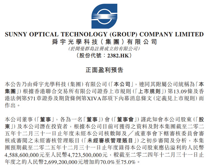 近日,舜宇光學(xué)科技 (集團(tuán)) 有限公司(股份代號(hào):2382.HK,以下簡稱 “舜宇光學(xué)” 或 “集團(tuán)”)根據(jù)香港聯(lián)合交易所有限公司證券上市規(guī)則第 13.09 條及香港法例第 571 章證券及期貨條例第 XIVA 部內(nèi)幕消息條文,發(fā)布 2025 年度正面盈利預(yù)告。公告顯示,集團(tuán)預(yù)計(jì)截至 2025 年 12 月 31 日止年度股東應(yīng)占溢利介于人民幣 45.886 億元至 47.235 億元之間,較 2024 年同期的人民幣 26.992 億元大幅增長 70.0% 至 75.0%。