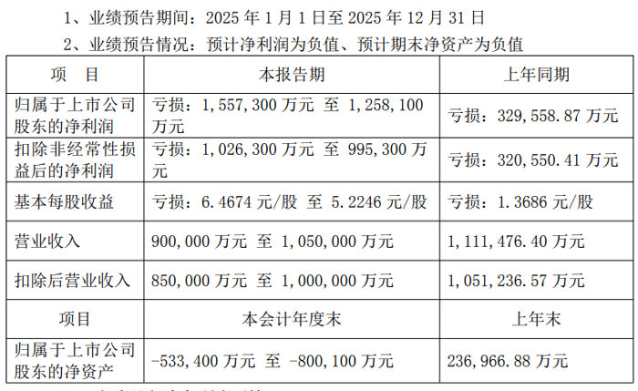 凈資產(chǎn)方面,截至 2025 年會(huì)計(jì)年度末,公司歸屬于上市公司股東的凈資產(chǎn)預(yù)計(jì)為 - 53.34 億元至 - 80.01 億元,而上年末該指標(biāo)為 23.696688 億元,由正轉(zhuǎn)負(fù)。