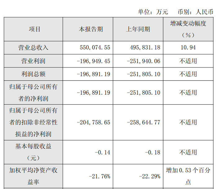 業(yè)績快報顯示,2025 年度公司實現(xiàn)營業(yè)總收入 550,074.55 萬元,較上年同期的 495,831.18 萬元增長 10.94%,營收規(guī)模穩(wěn)步擴(kuò)大。盈利方面,盡管仍處于虧損狀態(tài),但改善幅度顯著:歸屬于母公司所有者的凈利潤為 - 196,891.19 萬元,較上年同期的 - 251,805.10 萬元虧損減少 54,913.91 萬元,改善幅度達(dá) 21.81%;歸屬于母公司所有者的扣除非經(jīng)常性損益的凈利潤為 - 204,758.65 萬元,較上年同期的 - 258,644.77 萬元虧損減少 53,886.12 萬元,改善幅度為 20.83%。基本每股收益為 - 0.14 元,加權(quán)平均凈資產(chǎn)收益率為 - 21.76%,較上年同期的 - 22.29% 增加 0.53 個百分點。