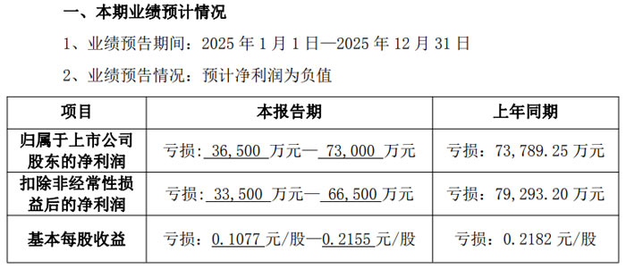 根據(jù)業(yè)績預(yù)告,公司 2025 年業(yè)績預(yù)告期間為 2025 年 1 月 1 日至 12 月 31 日,預(yù)計(jì)歸屬于上市公司股東的凈利潤虧損 36,500 萬元 - 73,000 萬元,上年同期該數(shù)據(jù)為虧損 73,789.25 萬元;扣除非經(jīng)常性損益后的凈利潤預(yù)計(jì)虧損 33,500 萬元 - 66,500 萬元,較上年同期的虧損 79,293.20 萬元同樣實(shí)現(xiàn)減虧;基本每股收益預(yù)計(jì)虧損 0.1077 元 / 股 - 0.2155 元 / 股,上年同期為虧損 0.2182 元 / 股。