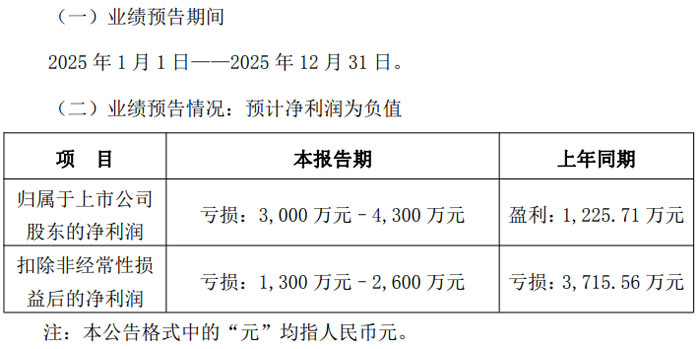 業(yè)績預告期間為 2025 年 1 月 1 日至 2025 年 12 月 31 日。財務數(shù)據(jù)方面,公司歸屬于上市公司股東的凈利潤預計虧損 8000 萬元至 6500 萬元,上年同期為盈利 9709.00 萬元,同比下降 182.40% 至 166.95%;扣除非經(jīng)常性損益后的凈利潤預計虧損 8700 萬元至 7200 萬元,上年同期盈利 7107.22 萬元,同比下降 222.41% 至 201.31%;基本每股收益為虧損 0.04 元 / 股,上年同期為盈利 0.05 元 / 股。