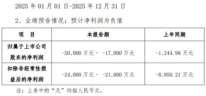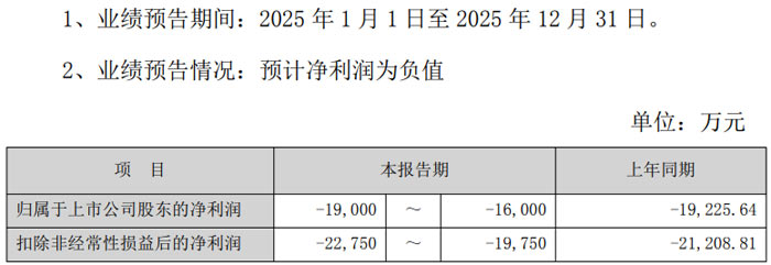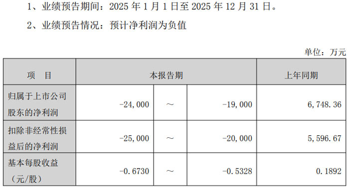 業(yè)績預告數(shù)據(jù)顯示,2025 年 1 月 1 日至 12 月 31 日期間,公司歸屬于上市公司股東的凈利潤預計虧損 19,000 萬元至 24,000 萬元,上年同期該數(shù)據(jù)為盈利 6,748.36 萬元;扣除非經(jīng)常性損益后的凈利潤預計虧損 20,000 萬元至 25,000 萬元,上年同期盈利 5,596.67 萬元;基本每股收益預計為 - 0.5328 元 / 股至 - 0.6730 元 / 股,上年同期為 0.1892 元 / 股。