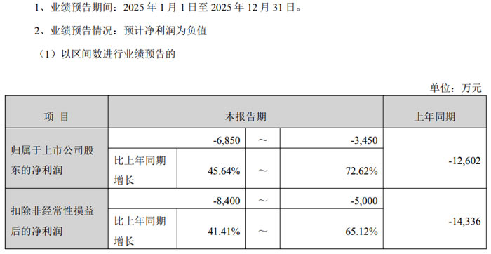 從具體財務數(shù)據(jù)來看,扣除非經(jīng)常性損益后的凈利潤方面,公司 2025 年預計虧損 1300 萬元–2600 萬元,較上年同期的虧損 3715.56 萬元有所收窄。本次業(yè)績預告相關財務數(shù)據(jù)均為公司財務部門初步測算結果,未經(jīng)注冊會計師審計,公司已就業(yè)績預告有關事項與會計師事務所進行初步溝通,雙方不存在分歧。