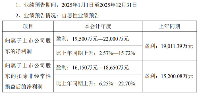 扣除非經(jīng)常性損益后,公司 2025 年度歸屬于上市公司股東的凈利潤預計為 15,500 萬元至 18,000 萬元,較上年同期的 11,400.09 萬元增加 4,100 萬元至 6,600 萬元,同比增長 36% 至 58%。據(jù)悉,上年同期公司每股收益為 0.174 元。