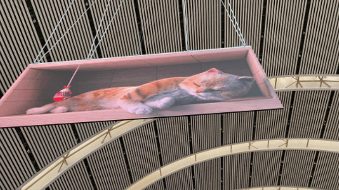 這里也是洲明獨創(chuàng)虛擬IP“大橘”的新家。屏幕中,憨態(tài)可掬的橘貓正追逐著玩具,尾巴輕掃,玩具仿佛要躍出屏幕......裸眼3D的視覺效果逼真靈動,希望這只“大橘”能讓許多趕路的旅客會心一笑,卸下路途的疲憊。