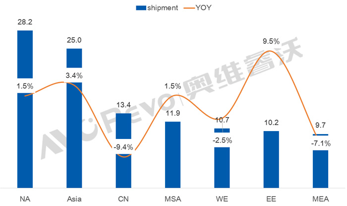 北美與亞洲作為TV代工訂單的主要出貨區(qū)域,在下半年分別迎來(lái)“黑五”與“排燈節(jié)”等促銷節(jié)點(diǎn),備貨節(jié)奏緊張,帶動(dòng)了兩地代工訂單的增長(zhǎng)。印度消費(fèi)稅的降低也在一定程度上刺激了亞洲地區(qū)的消費(fèi),為TV代工訂單提供了額外動(dòng)力。與之相對(duì),中國(guó)市場(chǎng)進(jìn)入下半年后,終端需求持續(xù)不振,國(guó)內(nèi)TV代工訂單相應(yīng)下滑,品牌逐漸將訂單轉(zhuǎn)向海外。東歐作為中國(guó)毗鄰區(qū)域,受益于“一帶一路”政策支持,成為承接國(guó)內(nèi)品牌訂單轉(zhuǎn)移的重要地區(qū)之一,TV代工出貨量同比增長(zhǎng)9.5%。中南美地區(qū)下半年出貨表現(xiàn)平平,但受上半年本地訂單需求增長(zhǎng)的帶動(dòng),全年仍實(shí)現(xiàn)1.5%的同比增長(zhǎng)。西歐與中東非地區(qū)則因當(dāng)?shù)亟?jīng)濟(jì)疲軟、消費(fèi)能力受限,出貨表現(xiàn)相對(duì)較弱,同比分別下降2.5%與7.1%。