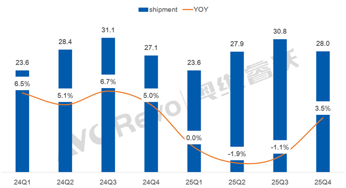 025年在年底沖刺備貨的驅(qū)動(dòng)下,代工市場(chǎng)扭轉(zhuǎn)前兩季下降趨勢(shì),奧維睿沃(AVC Revo)《全球TV代工廠月度出貨數(shù)據(jù)報(bào)告》顯示,2025年全球TV代工累計(jì)出貨近110.3M,同比增長(zhǎng)0.1%,四季度出貨達(dá)28.0M,同比增長(zhǎng)3.5%,全年出貨節(jié)奏呈“V”型增長(zhǎng)。