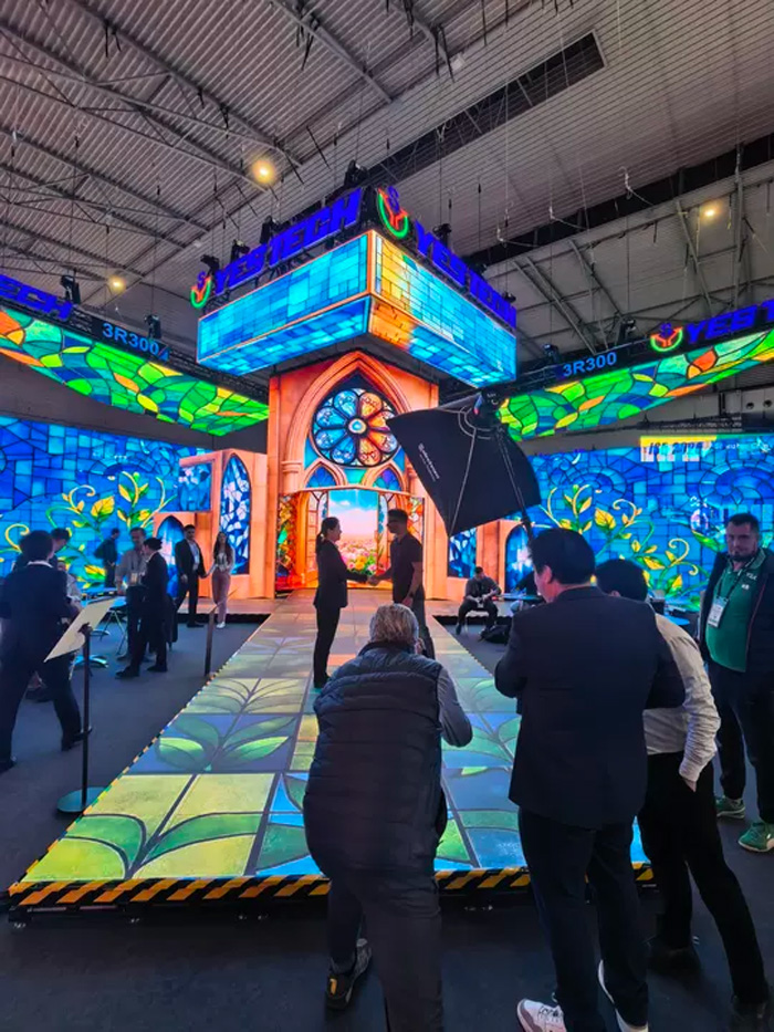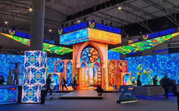 新亞勝展位的“YESphere”舞臺設(shè)計占地300平方,整合了地磚屏、異形屏、弧形屏、直角屏、吊裝屏和透明屏等租賃產(chǎn)品,構(gòu)建了一個層次豐富、功能互聯(lián)的立體創(chuàng)意空間,直觀呈現(xiàn)了“一屏通用、一屏百變”如何從產(chǎn)品理念,進階為完整的租賃舞臺解決方案。