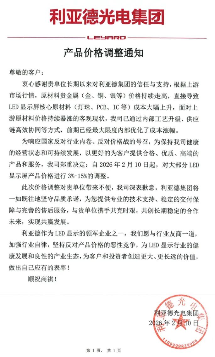 為響應(yīng)國(guó)家反對(duì)行業(yè)內(nèi)卷、反對(duì)價(jià)格戰(zhàn)的號(hào)召,為保持我司健康的經(jīng)營(yíng)狀態(tài)和可持續(xù)發(fā)展,以更好的為客戶提供合格、優(yōu)質(zhì)、高端的產(chǎn)品和服務(wù),我司鄭重決定:自2026年2月10日起,對(duì)大部分LED顯示屏產(chǎn)品價(jià)格進(jìn)行3%-15%的調(diào)整。