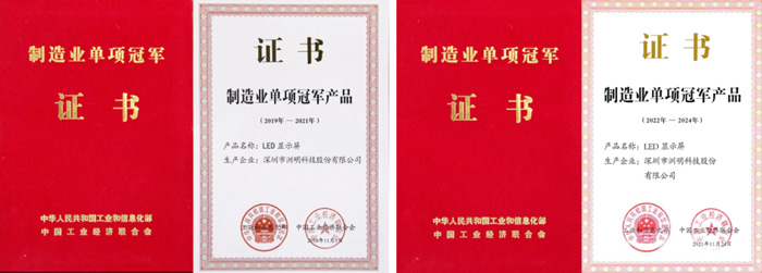 2019年、2022年,洲明LED顯示屏連續(xù)兩屆獲評(píng)“工信部制造業(yè)單項(xiàng)冠軍產(chǎn)品”。