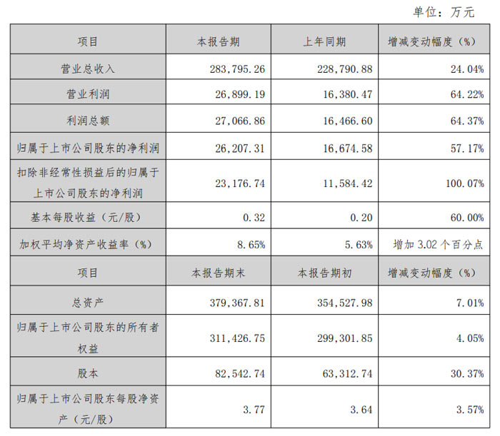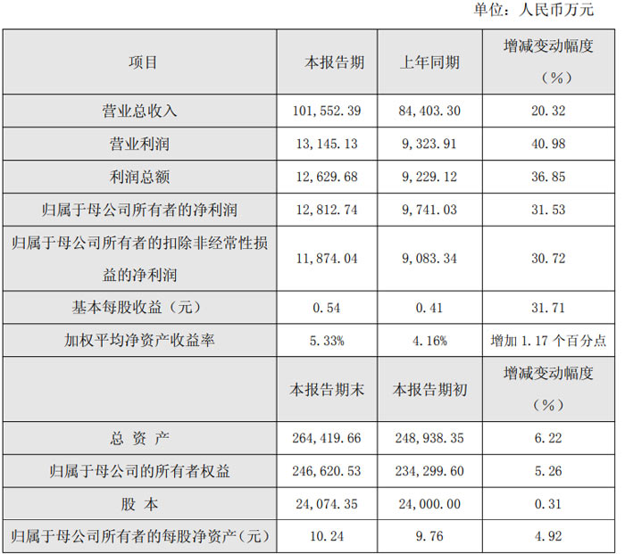 歸屬于母公司所有者的凈利潤(rùn)為 2.34 億元,較上年同期的 2.75 億元同比下降 15.05%;歸屬于母公司所有者的扣除非經(jīng)常性損益的凈利潤(rùn) 2.19 億元,較上年同期的 2.47 億元同比下降 11.33%。基本每股收益 0.57 元,較上年同期的 0.68 元同比下降 16.18%;加權(quán)平均凈資產(chǎn)收益率 10.22%,較上年同期的 13.43% 減少 3.21 個(gè)百分點(diǎn)。