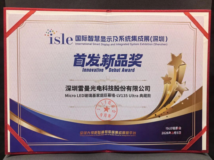 3月5日,ISLE 2026在深圳國際會展中心盛大啟幕。雷曼光電攜全場景LED顯示解決方案重磅登陸7-B01展位。開展首日,Micro LED玻璃基巨幕全球首發(fā),一舉斬獲ISLE 2026“首發(fā)新品獎”,成為全場矚目的技術(shù)焦點。