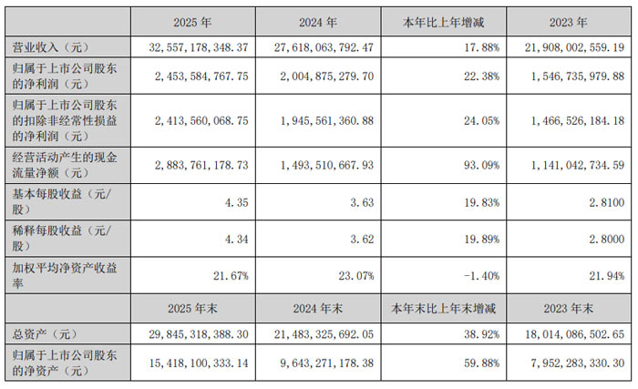 2026 年 3 月,惠州市德賽西威汽車電子股份有限公司(股票簡稱:德賽西威,股票代碼:002920)發(fā)布 2025 年年度報告。報告顯示,公司全年實(shí)現(xiàn)營業(yè)收入 325.57 億元,同比增長 17.88%;歸屬于上市公司股東的凈利潤 24.54 億元,同比增長 22.38%;基本每股收益 4.35 元,同比增長 19.83%,各項(xiàng)核心財務(wù)指標(biāo)均實(shí)現(xiàn)穩(wěn)步提升,彰顯了公司在汽車智能化浪潮中的強(qiáng)勁發(fā)展韌性。