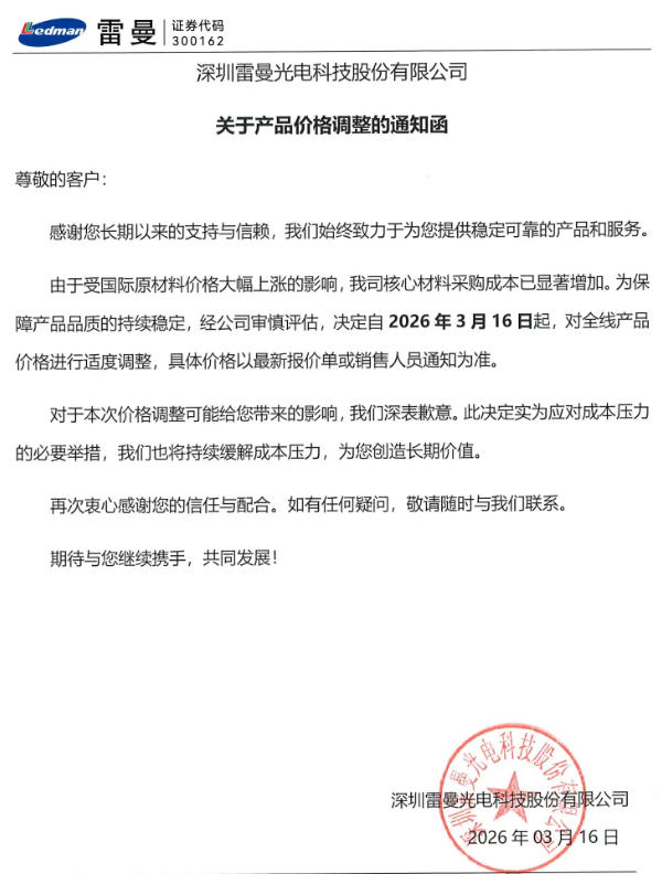 重要通知 | 雷曼光電產(chǎn)品價格調(diào)整