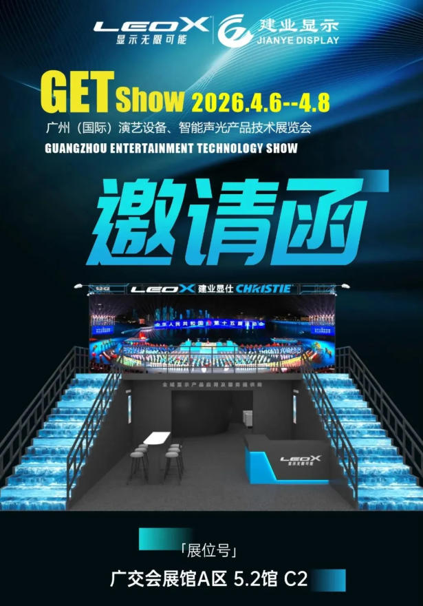 2026 GETshow 將以 14 大展館的規(guī)模,全面展示專業(yè)燈光、音響、投影及文旅裝備等領(lǐng)域的最新成果。建業(yè)顯示作為全域顯示產(chǎn)品應(yīng)用及服務(wù)提供商,將打造一個(gè)階梯式立體的展示空間。