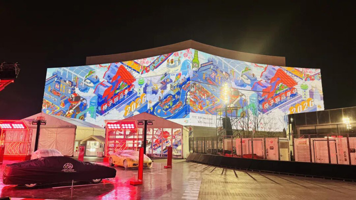 14臺巴可QDX-4K45分別配備長焦和廣角鏡頭,在西岸大劇院的兩塊外墻上完成光雕投影,將這座建筑獨特的水波紋立面與賽車文化相融,循環(huán)播放世界級賽車錦標賽官方宣傳片及贊助商品牌影像,實現(xiàn)藝術美感與商業(yè)傳播的共贏。