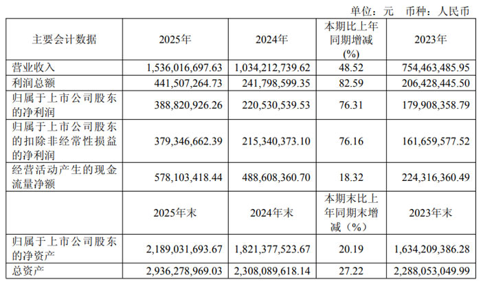 2025 年,藍(lán)特光學(xué)緊抓行業(yè)發(fā)展機(jī)遇,依托核心客戶群優(yōu)勢與多樣化產(chǎn)品布局,實(shí)現(xiàn)營業(yè)收入 15.36 億元,較上年同期的 10.34 億元增長 48.52%;利潤總額達(dá) 4.42 億元,同比增長 82.59%;歸母凈利潤 3.89 億元,較上年的 2.21 億元增長 76.31%;扣非凈利潤 3.79 億元,同比增長 76.16%。