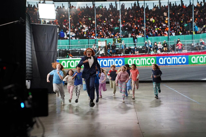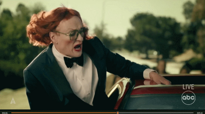 每屆都有新活的主持人柯南,這次在開(kāi)場(chǎng)惡搞短片中cosplay《兇器》中的格拉迪斯姨媽?zhuān)┰竭M(jìn)各大入圍影片。短片在雷迪奧LED顯示屏搭建的虛擬影棚中拍攝,免去后期綠幕合成和特效制作,加上切鏡剪輯,實(shí)現(xiàn)無(wú)縫穿梭。