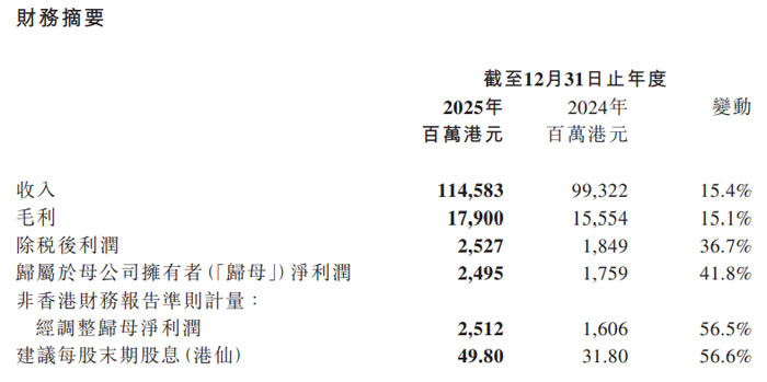 2025 年,TCL 電子實現(xiàn)營收 1145.83 億港元,較 2024 年的 993.22 億港元同比增長 15.4%;毛利達 179.00 億港元,同比增長 15.1%;除稅后利潤 25.27 億港元,同比增長 36.7%;歸屬于母公司擁有者凈利潤 24.95 億港元,同比大幅增長 41.8%;經(jīng)調(diào)整歸母凈利潤 25.12 億港元,同比飆升 56.5%。為回饋股東,公司建議派發(fā)末期股息每股 49.80 港仙,較 2024 年的 31.80 港仙增長 56.6%,派息率達經(jīng)調(diào)整歸母凈利潤的約 50%,持續(xù)踐行高派息政策。