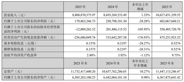 2026 年 3 月,創(chuàng)維數(shù)字股份有限公司(股票簡(jiǎn)稱:創(chuàng)維數(shù)字,股票代碼:000810)發(fā)布 2025 年年度報(bào)告。報(bào)告顯示,公司全年實(shí)現(xiàn)營(yíng)業(yè)收入 88.09 億元,同比增長(zhǎng) 1.33%;歸屬于上市公司股東的凈利潤(rùn) 1.80 億元,同比下降 28.28%;歸屬于上市公司股東的扣除非經(jīng)常性損益的凈利潤(rùn)為 - 0.12 億元;基本每股收益 0.16 元。截至 2025 年末,公司總資產(chǎn)達(dá) 117.52 億元,同比增長(zhǎng) 10.27%;歸屬于上市公司股東的凈資產(chǎn) 65.05 億元,同比增長(zhǎng) 0.98%。