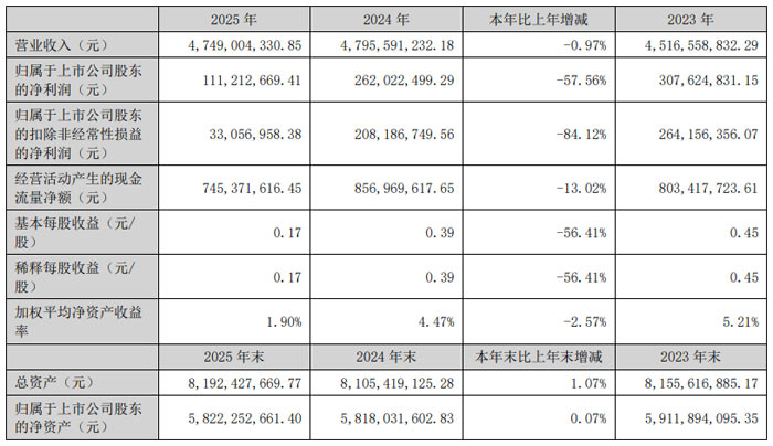 2026 年 3 月,蘇州安潔科技股份有限公司(股票簡稱:安潔科技,股票代碼:002635)發(fā)布 2025 年年度報告。報告顯示,公司全年實現(xiàn)營業(yè)收入 47.49 億元,較上年同期小幅下降 0.97%;歸屬于上市公司股東的凈利潤 1.11 億元,歸屬于上市公司股東的扣除非經(jīng)常性損益的凈利潤 0.33 億元;基本每股收益 0.17 元。截至 2025 年末,公司總資產(chǎn)達 81.92 億元,歸屬于上市公司股東的凈資產(chǎn) 58.22 億元,整體經(jīng)營穩(wěn)健。