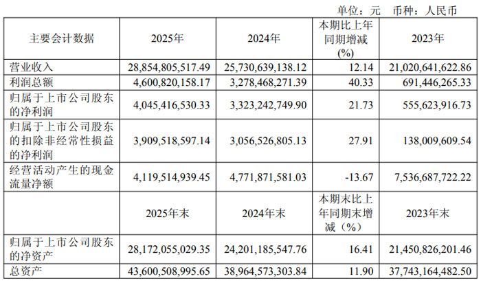 基本每股收益為 3.37 元 / 股,同比增長 21.66%;加權(quán)平均凈資產(chǎn)收益率達 15.39%,較上年增加 0.56 個百分點,盈利質(zhì)量穩(wěn)步提升。從季度表現(xiàn)來看,公司各季度營收分布相對均衡,其中第三季度營收最高,達 78.27 億元,歸屬于上市公司股東的凈利潤 11.82 億元,為全年業(yè)績增長提供有力支撐。