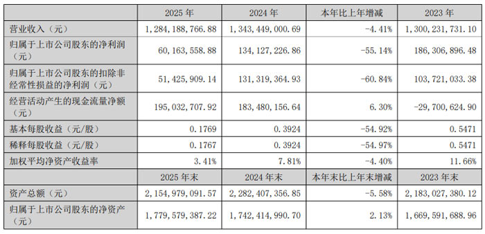 3 月 31 日,中穎電子股份有限公司(股票簡稱:中穎電子,股票代碼:300327)發(fā)布 2025 年年度報(bào)告。報(bào)告顯示,公司全年實(shí)現(xiàn)營業(yè)收入 12.84 億元,同比下滑 4.41%;歸屬于上市公司股東的凈利潤 6016.36 萬元,同比下滑 55.14%;歸屬于上市公司股東的扣除非經(jīng)常性損益凈利潤 5142.59 萬元,同比下滑 60.84%;基本每股收益 0.18 元。盡管業(yè)績面臨短期壓力,公司核心競爭力未發(fā)生重大不利變化,持續(xù)盈利能力穩(wěn)固。