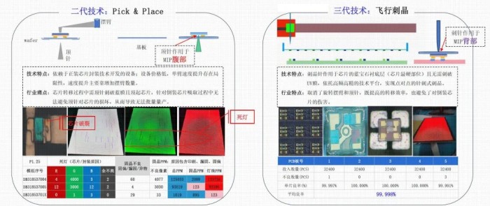 傳統(tǒng)二代 Pick & Place 技術(shù)依賴正裝芯片,單臂速度提升有限,且頂針操作易損壞芯片,導(dǎo)致死燈、全不亮、不良像素等問題頻發(fā),從實際生產(chǎn)數(shù)據(jù)來看,傳統(tǒng)工藝的不良 PPM 數(shù)值居高不下,難以實現(xiàn)穩(wěn)定量產(chǎn)。