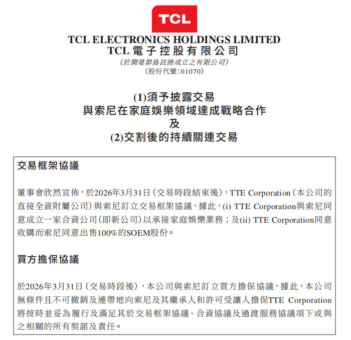 2026年3月31日,TCL電子發(fā)布公告,TCL電子以約37.8億港元現(xiàn)金,與索尼正式敲定合資協(xié)議,同時收購索尼馬來西亞子公司SOEM,全面承接索尼家庭娛樂業(yè)務(wù)。