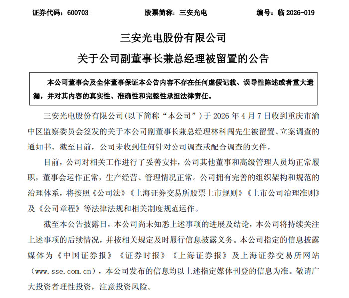 4月8日晚間,三安光電股份有限公司《關(guān)于公司副董事長兼總經(jīng)理被留置的公告》,公告表示,三安光電股份有限公司于 2026 年4 月7 日收到重慶市渝中區(qū)監(jiān)察委員會(huì)簽發(fā)的關(guān)于本公司副董事長兼總經(jīng)理林科闖先生被留置、立案調(diào)查的通知書。截至目前,公司未收到任何針對(duì)公司調(diào)查或配合調(diào)查的文件。