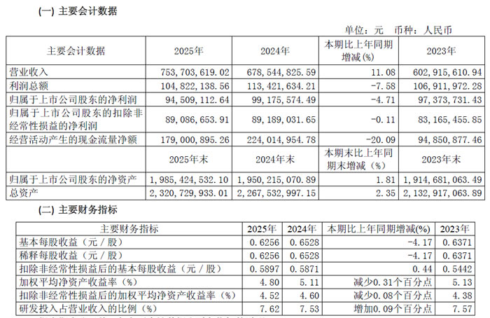 2025 年,沃爾德實(shí)現(xiàn)營業(yè)收入 7.54 億元,較上年同期增長 11.08%;實(shí)現(xiàn)利潤總額 1.05 億元,較上年同期下降 7.58%;歸屬于上市公司股東的凈利潤 0.95 億元,較上年同期下降 4.71%;扣除非經(jīng)常性損益后的凈利潤 0.89 億元,較上年同期微降 0.11%。