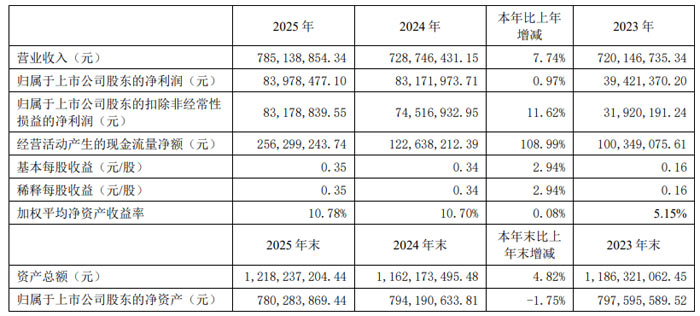 2025 年,勁拓股份實現(xiàn)營業(yè)總收入7.85 億元,較上年同期增長7.74%;歸屬于上市公司股東的凈利潤0.84 億元,同比增長0.97%;歸屬于上市公司股東的扣除非經(jīng)常性損益的凈利潤0.83 億元,同比增長11.62%;經(jīng)營活動產(chǎn)生的現(xiàn)金流量凈額2.56 億元,同比大幅增長108.99%,盈利質(zhì)量與現(xiàn)金回款能力顯著增強(qiáng)。