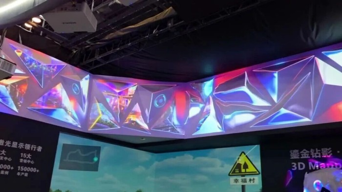 由多臺7000流明的新款EL Pro雙百系列投影機協(xié)同作業(yè),在鉆石立體墻面完成無縫環(huán)繞投影。該系列依托視美樂獨創(chuàng)C.Bright技術(shù)體系中的Bright+亮彩技術(shù),成為行業(yè)首款實現(xiàn) 100% 色亮與 100% 亮度實標(biāo)的 DLP 投影機,具有里程碑式的獨特意義。立體的鉆石棱面在展廳超強的環(huán)境光下依然折射出璀璨光影,虛實交織,美輪美奐。