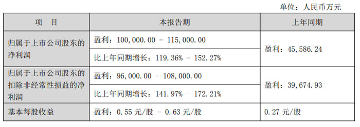 根據(jù)業(yè)績預(yù)告,2026 年 1 月 1 日至 3 月 31 日期間,歸屬于上市公司股東的凈利潤預(yù)計(jì)盈利 10.00 億元至 11.50 億元,上年同期盈利 4.56 億元,同比增長 119.36% 至 152.27%;歸屬于上市公司股東的扣除非經(jīng)常性損益的凈利潤預(yù)計(jì)盈利 9.60 億元至 10.80 億元,上年同期盈利 3.97 億元,同比增長 141.97% 至 172.21%;久抗墒找骖A(yù)計(jì)盈利 0.55 元 / 股至 0.63 元 / 股,上年同期為 0.27 元 / 股。