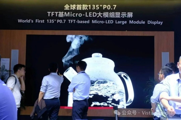 在辰顯光電的展位上,多款全球首發(fā)的TFT基Micro-LED產(chǎn)品集體亮相,瞬間點燃了現(xiàn)場專業(yè)人士和行業(yè)媒體的熱情。其中,全球首款270" 8K TFT基Micro-LED顯示屏尤為吸睛,超大尺寸搭配極致清晰的8K分辨率,細(xì)膩的色彩過渡、精準(zhǔn)的明暗對比,讓每一位駐足體驗者都沉浸在震撼的視覺盛宴中,紛紛贊嘆其為“視聽領(lǐng)域的革命性突破”。