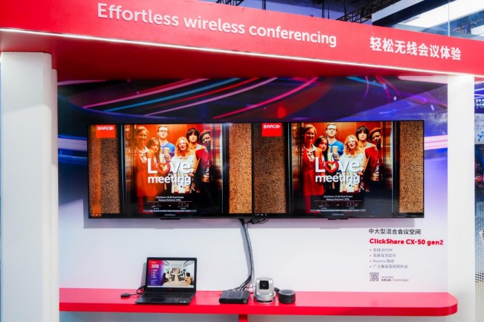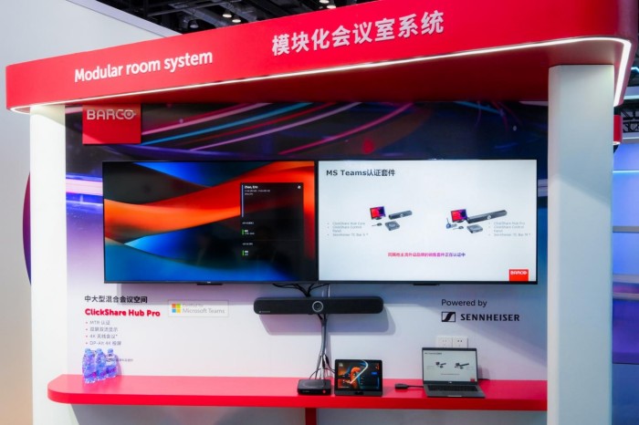 中大型混合會(huì)議空間布局3種方案。由86英寸可立享無線會(huì)議屏實(shí)現(xiàn)的BYOM一體化解決方案,用戶可使用自己的筆記本輕松進(jìn)行無線協(xié)作與視頻會(huì)議;ClickShare Hub Pro與Sennheiser TeamConnect Bar M及2臺(tái)55寸顯示屏實(shí)現(xiàn)的MTR雙屏視頻會(huì)議方案,格外適合中大型混合會(huì)議空間應(yīng)用場(chǎng)景;可立享CX-50 Gen2搭配麥克風(fēng)、攝像頭以及兩臺(tái)55寸顯示屏的雙屏分體式方案,則是為新建或升級(jí)大型會(huì)議室的企業(yè),帶來了部署靈活、功能專業(yè)的解決方案。