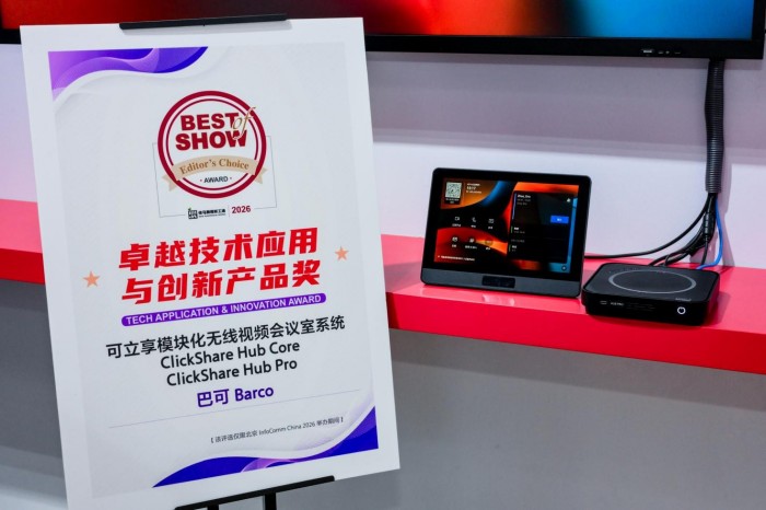 展會(huì)期間,巴可榮獲本屆InfoComm China 2026的“Best of Show”獎(jiǎng)項(xiàng)?闪⑾鞨ub模塊化無線視頻會(huì)議室系統(tǒng)、Encore3圖像處理平臺(tái)兩款重磅產(chǎn)品,憑借領(lǐng)先的技術(shù)應(yīng)用與創(chuàng)新性,一舉斬獲卓越技術(shù)應(yīng)用與創(chuàng)新產(chǎn)品獎(jiǎng)。