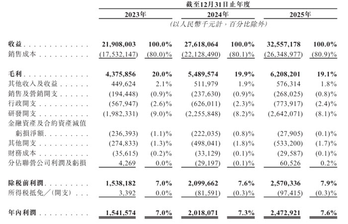 招股書顯示,德賽西威2023年、2024年、2025年營收分別為219億、 276.18億、 325.57億元;毛利分別為43.76億、 54.9億、 62億;毛利率分別為20%、19.9%、19.1%。利潤方面,德賽西威2023年、2024年、2025年年內(nèi)利潤分別為15.42億、20.18億、24.73億;年內(nèi)利潤率分別為7%、7.3%、7.6%。