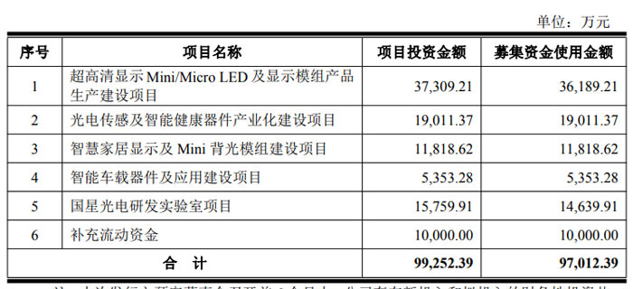 本次發(fā)行預(yù)計募集資金總額不超過9.70 億元,扣除發(fā)行費用后全部投向六大項目:超高清顯示 Mini/Micro LED 及顯示模組產(chǎn)品生產(chǎn)建設(shè)項目,擬使用募集資金3.62 億元;光電傳感及智能健康器件產(chǎn)業(yè)化建設(shè)項目,擬使用募集資金1.90 億元;智慧家居顯示及 Mini 背光模組建設(shè)項目,擬使用募集資金1.18 億元;智能車載器件及應(yīng)用建設(shè)項目,擬使用募集資金0.54 億元;國星光電研發(fā)實驗室項目,擬使用募集資金1.46 億元;補充流動資金,擬使用募集資金1.00 億元。