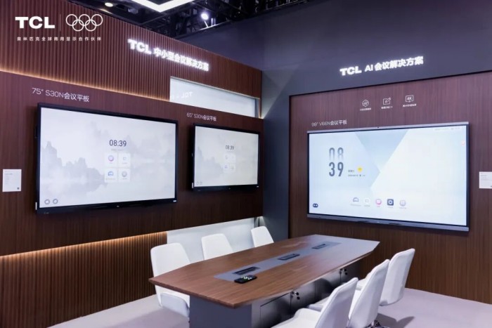 在智慧辦公展區(qū),TCL構(gòu)建了一個從中小型會議室到大型報告廳的全場景演示環(huán)境,會議產(chǎn)品尺寸覆蓋50至136英寸,以滿足各類企業(yè)空間快速部署與高效協(xié)同的需求。