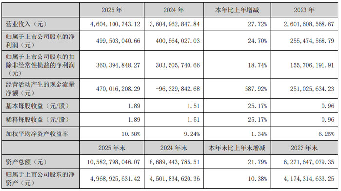 2025 年,江豐電子實現(xiàn)營業(yè)收入46.04 億元,同比增長27.72%;歸屬于上市公司股東的凈利潤4.99 億元,同比增長24.70%;歸屬于上市公司股東的扣除非經(jīng)常性損益的凈利潤3.60 億元,同比增長18.74%。