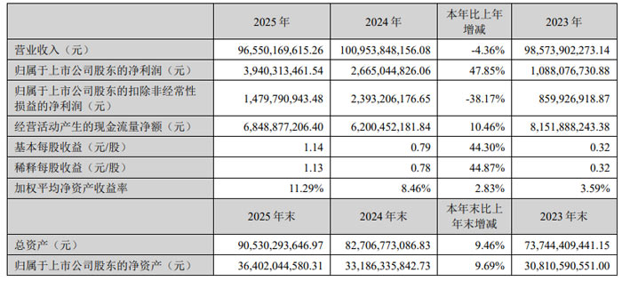 2025 年,歌爾股份實(shí)現(xiàn)營業(yè)收入 965.50 億元,同比下降 4.36%;實(shí)現(xiàn)歸屬于上市公司股東的凈利潤 39.40 億元,同比大幅增長 47.85%;扣除非經(jīng)常性損益后的凈利潤 14.80 億元,同比下降 38.17%。