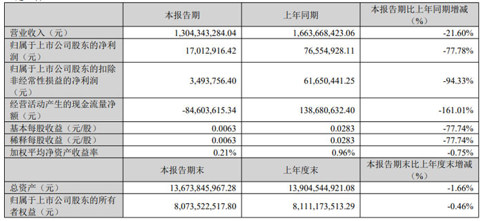 經(jīng)營活動產(chǎn)生的現(xiàn)金流量凈額為 - 0.85 億元,同比下降 161.01%。截至 2026 年 3 月 31 日,企業(yè)總資產(chǎn)為 136.74 億元,較上年度末下降 1.66%;歸屬于上市公司股東的所有者權(quán)益為 80.74 億元,較上年度末下降 0.46%。
