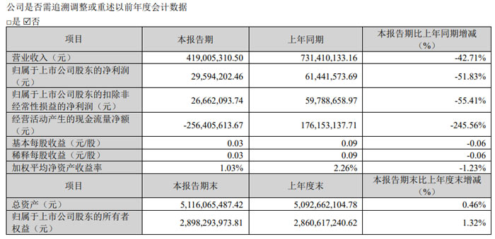 財(cái)務(wù)數(shù)據(jù)方面,2026 年第一季度,聚燦光電實(shí)現(xiàn)營(yíng)業(yè)收入 4.19 億元,同比下降 42.71%;歸屬于上市公司股東的凈利潤(rùn) 0.30 億元,同比下降 51.83%;歸屬于上市公司股東的扣除非經(jīng)常性損益的凈利潤(rùn) 0.27 億元,同比下降 55.41%;經(jīng)營(yíng)活動(dòng)產(chǎn)生的現(xiàn)金流量?jī)纛~為 - 2.56 億元,同比下降 245.56%。基本每股收益 0.03 元 / 股,同比下降 0.06 元 / 股;加權(quán)平均凈資產(chǎn)收益率 1.03%,較上年同期減少 1.23 個(gè)百分點(diǎn)。